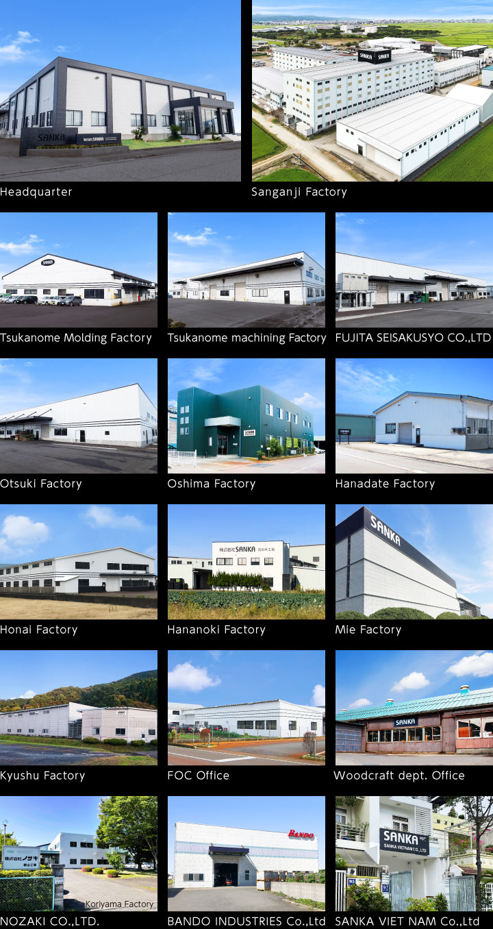 | Office Location | Headquarter 2153-5 Tsukanome Sanjo Niigata TEL.+81-256-36-1113 FAX.+81-256-36-1114 E-mail: info@sanka.ne.jp Administrations and Accounting TEL. 0256-47-4273 FAX.0256-47-4274 Industrial Equipment Dept. TEL.0256-47-4270 FAX.0256-47-4278 Tsukanome Molding Factory 2153-5 Tsukanome Sanjo Niigata Tsukanome Machining Factory 320-1 Omiya-Shinden Sanjo Niigata Otsuki Factory 2163 Tsukanome-Otsuki Sanjo Niigata Sanganji Factory 965-1 Sanganji-Shinden Sanjo Niigata TEL.+81-256-46-0037 FAX.+81-256-46-8120 Oshima Factory 980 Ogijima Sanjo Niigata Hanadate Factory 4-15-45 Tsukanome Sanjo Niigata Honai Factory 221 Kamihonai-otsu Sanjo Niigata Hananoki Factory 175-1 Hananoki Higashihonjoji Sanjo Niigata TEL.+81-256-35-2305 FAX.+81-256-33-3852 Mie Factory 1781-3 Sanagucho Iga Mie TEL.+81-595-24-7575 FAX.+81-595-24-7577 Kyushu Factory 452 Matsusemen Saza Kitamatsuura Nagasaki TEL.+81-956-63-3300 FAX.+81-956-63-3318 FOC Office 2-8-37 Tsukanome Sanjo Niigata Woodcraft dept. Office 14-3 Minamishimbo Sanjo Niigata TEL.+81-256-32-0400 FAX.+81-256-32-0407 FUJITA SEISAKUSYO CO.,LTD. 303-1 Omiya-Shinden Sanjo Niigata TEL.+81-256-47-4287 FAX.+81-256-47-4259 NOZAKI CO.,LTD. 2563-3 Hiratsuka, Ageo, Saitama TEL. +81-(0)48-775-2121 FAX. +81-(0)48-775-2190 Koriyama Factory 98 Kawakubo Kanaya Tamura-machi Koriyama Fukushima TEL.+81-(0)24-943-3113 FAX.+81-(0)24-943-5365 BANDO INDUSTRIES Co.,Ltd 1670-1 Misatomachi-kashiwagizawa, Takasaki Gunma TEL.+81-(0)27-373-0662 FAX.+81-(0)27-373-7589 Niigata Logistics Center 6-1090 Aza-Shimizu Shimizu Niigata Minami-ku Niigata Kamosuda Office 2445-1 Urasuda Kamo Niigata SANKA VIET NAM Co.,Ltd Chanh Nghia residence No.97, D9 street, Chanh Nghia ward, Thu Dau Mot city, Binh Duong province VIET NAM Tokyo Office 2-21-4 Prendre Kaneko 1st Floor Funado Itabashi Tokyo Osaka Office 1-22-25 Plaisir Kitahorie 11th Floor Kitahorie, Nishi-ku, Osaka City, Osaka Fukuoka Office 1-16-1 Winds RiGaRo No 205 Kawarada Onojo Fukuoka |